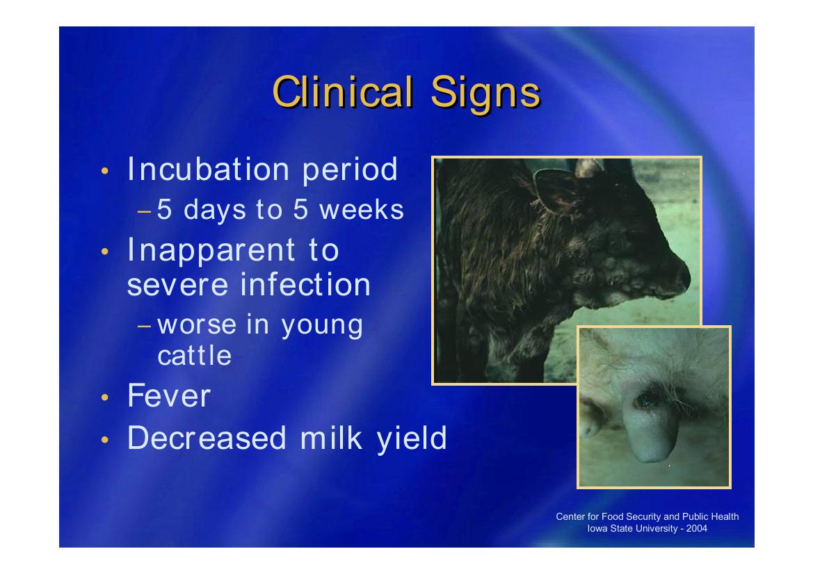 الأبقار هي العائل الطبيعي الوحيد الذي يتعرض لإصابات شديدة والإصابة تكون أكثر شده و مصحوبة بنسب تفوق أعلى بين العجول حيث يظهر المرض بصورته النمطية غالبا و الأوبئة عادة ما تحدث في موسم انتشار الحشرات كما حدث في مصر في صيف عام 1988 حيث انتشر المرض بسرعة في 22 من 26 محافظة.