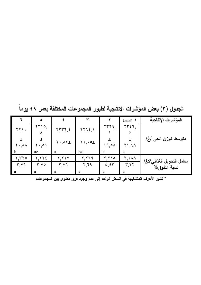 وفي عمر ٤٩ يومًا تم وزن جميع الطيور بشكل إفرادي، حسب م توسط الوزن الحي للذكور والإناث والمتوسط العام في كل مجموعة، كما تم تحديد معامل التحويل الغذائي ونسبة النفوق التراكمية،