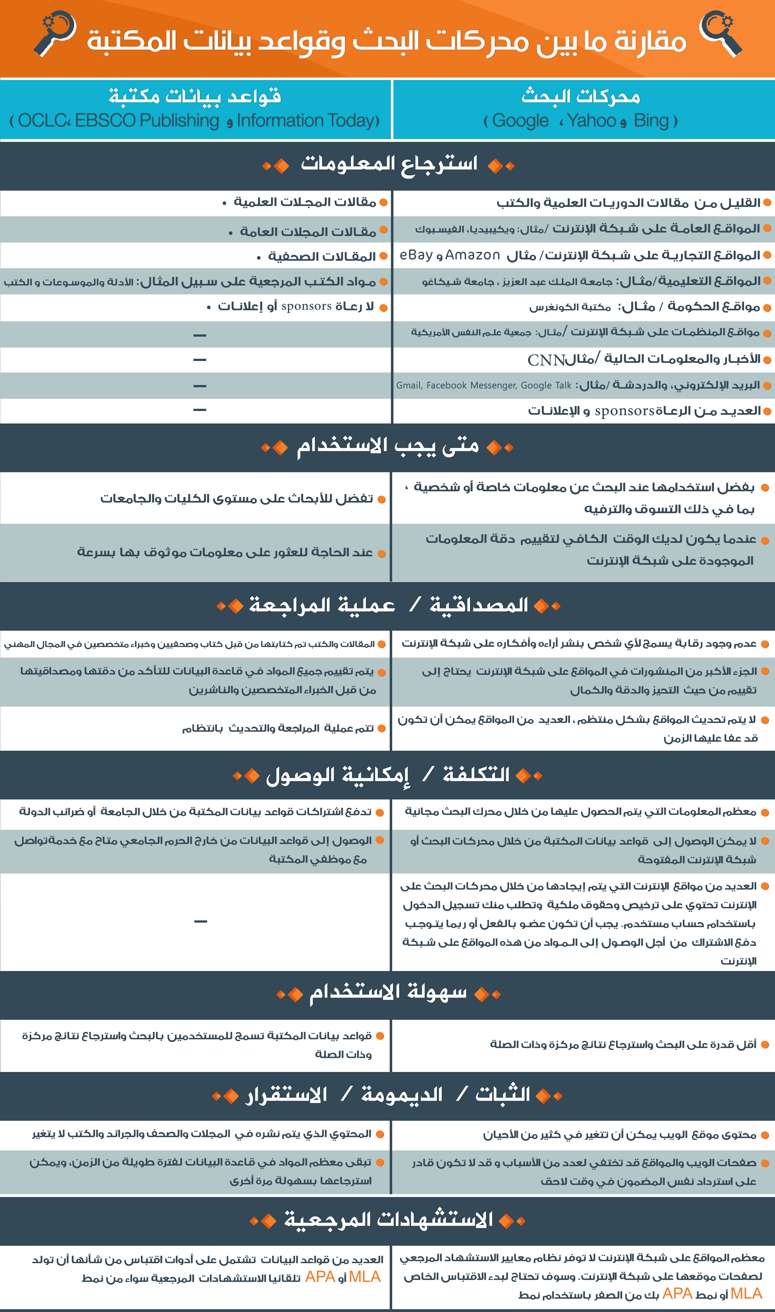 يعتمد ذلك على نوع المعلومات التي تبحث عنها وعلى الطريقة التي تخطط لاستخدامها. إذا كنت تريد المواد العلمية الموثوقة، سيكون لديك فرصة أكبر للنجاح في العثور على المصادر ذات الصلة في قاعدة بيانات المكتبة. وإذا كنت تريد بيانات عامة أو إحصائية، فيمكنك البحث عن ذلك باستخدام محركات البحث والتي ستكون أكثر فعالية في إيجاد هذه المعلومات وسوف ترشدك إلى الموقع المناسب.