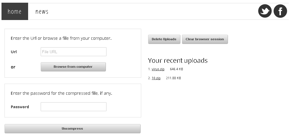 والتي تتنشر بكثرة على الفيسبوك حيث ان اغلبها عبارة عن برامج خبيثة يمكنك ان تتأكد من محتواها إنطلاقا من وضع الرابط في url على الموقع تم النقر على uncompress من اجل فك الضغط عن الملف دون تحميله على الحاسوب وتبقى بأمان من الإختراق، بالإضافة إلى انه يمكنك رفع اي ملف مضغوط على حاسوبك من اجل تصفح محتواه عن طريق النقر على choose file من اجل رفعه وفك الضغط عنه ، كما انه في حالة كان الملف محمي بباسورد فيمكنك كتابة الباسوورد في خانة password قبل انقر على فك الضغط uncompress