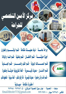 وكما تشاهدون هذه نبذة بسيطة من العمليات التي تجرى في مركز الامين التخصصي للجراحة ناهيك عن الخدمات الطبية الأخرى منها وكلها تجرى على ايدي كوادر متخصصة ذوي خبرات عريقة في هذا المجال . مركز الامين التخصصي للجراحة الرعاية الطبية كما تجب ان تكون . العنوان : صنعاء - الحصبه شارع الجامعة العربية جوار سوق الحصبة المركزي . تلفون:4 / 252783