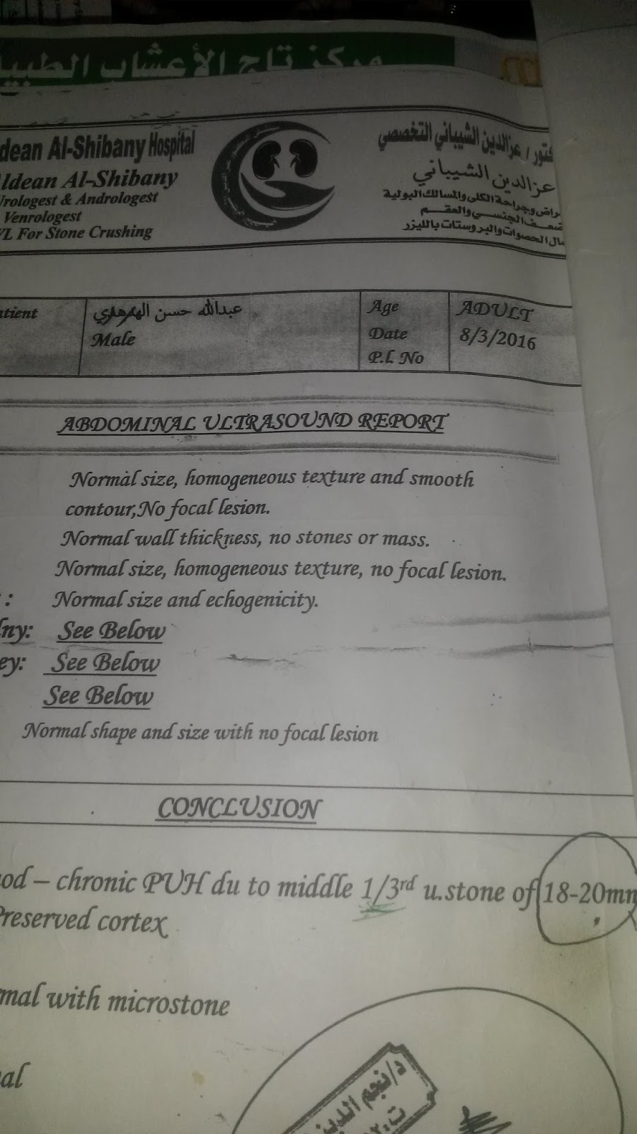 في الصورة الاولى لتقرير لحالة كانت تعاني من حصوه في الكلى وحجم الحصوة التي في الكلى وقياسها 20 مليمتر