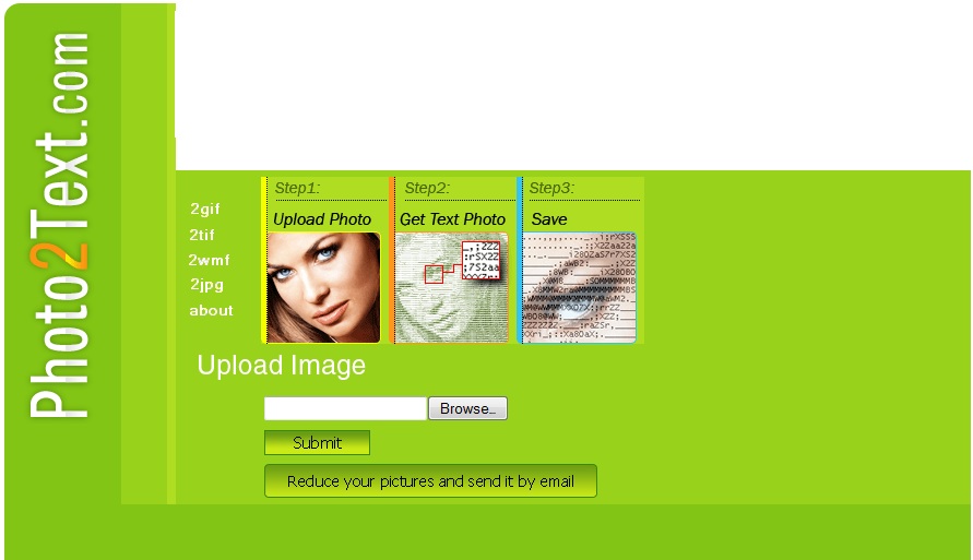 هذا الموقع يقدم خدمة تحويل الصور الى نصوص وذلك من خلال اعادة رسم الصورة بمجموعة كبيرة من الحروف مع وجود خيارات لتغيير مجموعة الحروف التي تريد الرسم بها وتغيير درجة الوضوح والسطوع بما يتناسب مع الصورة.