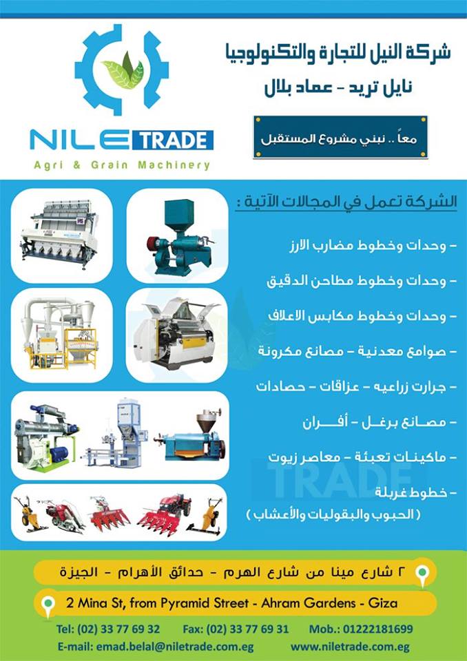 معدات مصانع الاعلاف والمعدات الزراعية وخطوط مصانع المكرونه وخطوط مضارب الارز وخطوط مطاحن الدقيق &شركة نايل تريد NILE TRADE ..,, لخطوط انتاج الدقيق ..,, وخطوط مضارب الأرز ..,, معدات وخطوط انتاج الأعلاف ..,,مكابس العلف..,,المعدات والميكنة الزراعية..,,جرارات زراعية..,,حصادات قمح وأرز ,, عزاقات ,, قطع غيار المطاحن والمضارب ومصانع الاعلاف والمعدات الزراعية ..,, الوكيل الوحيد لشركة فوبروFOPRO التركيه لصوامع الحبوب والغلال والوكيل الوحيد لشركة تشيلي الصينية لمضارب الارز والوكيل الوحيد لشركة QUILI الصينية لمعاصر الزيوت ..,,شركة النيل للتجارة والتكنولوجيا _نايل تريد - عماد بلال ,,,
